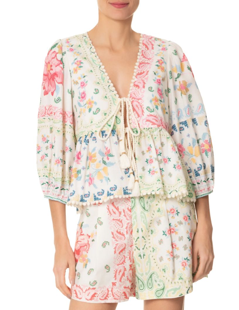 A bata off white é confeccionada em tecido leve sem elasticidade. A peça solta ao corpo possui decote V profundo, mangas 7/8 com elástico embutido nos punhos, abertura frontal com aplicação de cordões alongados com detalhes em tássel, recorte na parte inferior com efeito de babados, aplicação de detalhes em crochet na barra e na abertura frontal e fechamento frontal por amarração.