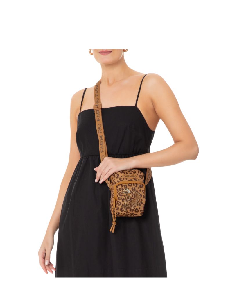A bolsa marrom é produzida em lona. A peça possui tamanho pequeno, formato retangular, compartimento interno com forro, bolso posterior, tag da marca aplicada em borracha na parte frontal, mix de estampas em cores contrastantes, alça de ombro média em gorguão com regulagem e nome da marca estampado em tom contrastante, bolso frontal com fechamento por zíper com puxador e fechamento superior por zíper.