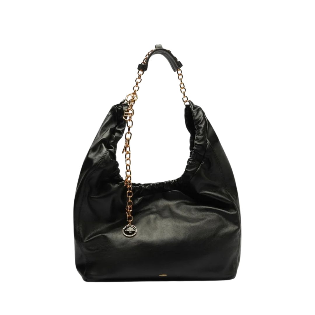Especificações; 32x15x25 cm O modelo tem formato arredondado e acabamento macio. Possui alça de ombro em corrente metálica com pingentes e ombreira de couro, além de fecho superior franzido.