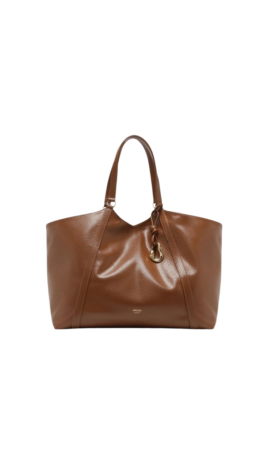 A bolsa shopping grande vem com uma textura sútil e acabamento levemente brilhante, com duas alças de ombro finas e um charm dourado em formato orgânico como destaque. Possui um estilo clássico, sofisticado e versátil.