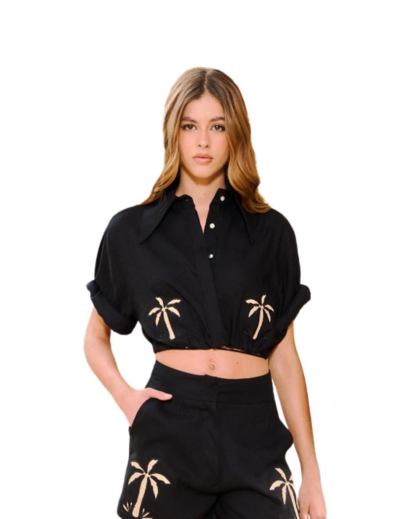Camisa Feminina Alfaiataria Em Linho Bordada • Open Preto