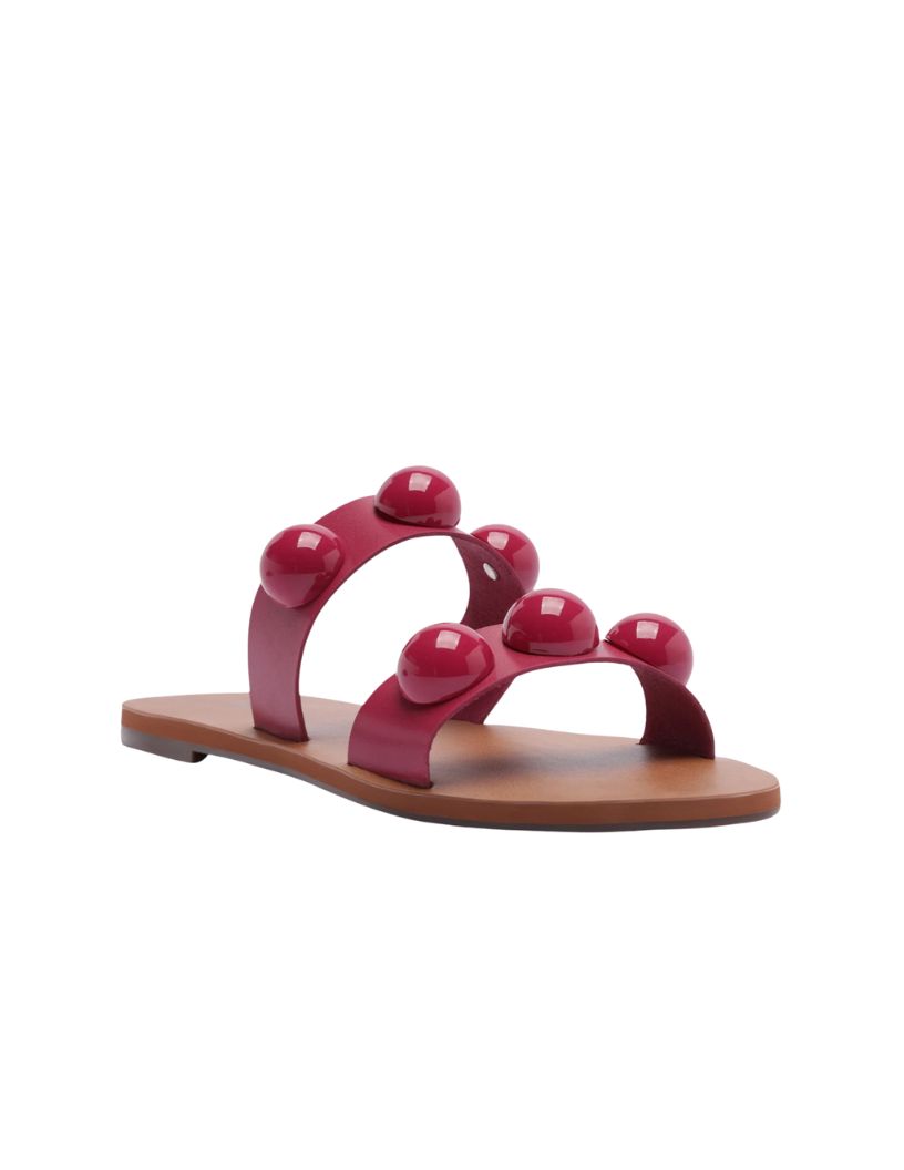 Rasteira Pop de tiras paralelas em couro, com detalhe em esferas, na cor rosa. O modelo possui solado rasteiro e emborrachado, com leve saltinho traseiro. De biqueira arredondada em couro, apresenta cabedal com duas tiras largas e paralelas - uma sobre os dedos e a outra sobre o peito de pé - com aplicação de trio de maxi esferas do mesmo tom da rasteirinha, sobre as tiras. Com assinatura Anacapri na palmilha marrom. Aberta, a rasteirinha exibe todo o pé.