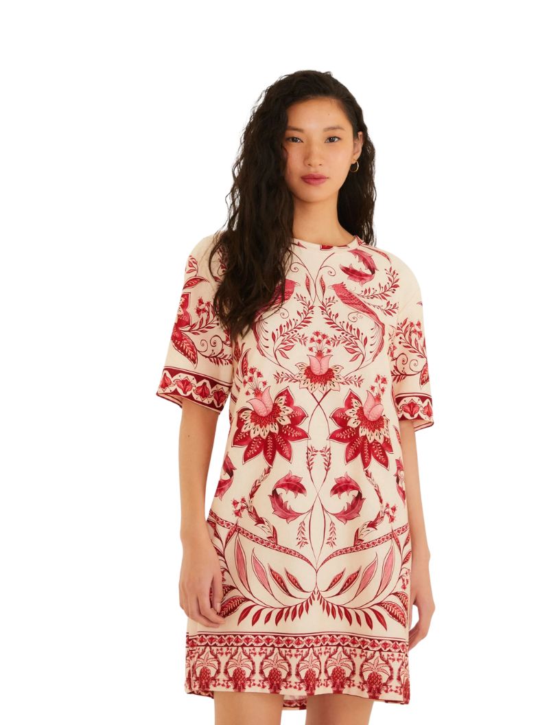 vestido t-shirt básico estampado nina. com corte reto, mangas curtas e decote redondo, esta peça é essencial para um visual casual. os detalhes da estampa única trazem autenticidade, perfeita para um dia no parque ou um almoço descontraído. um toque leve e cheio de personalidade para o seu guarda-roupa. FARM RIO original - verão 26.